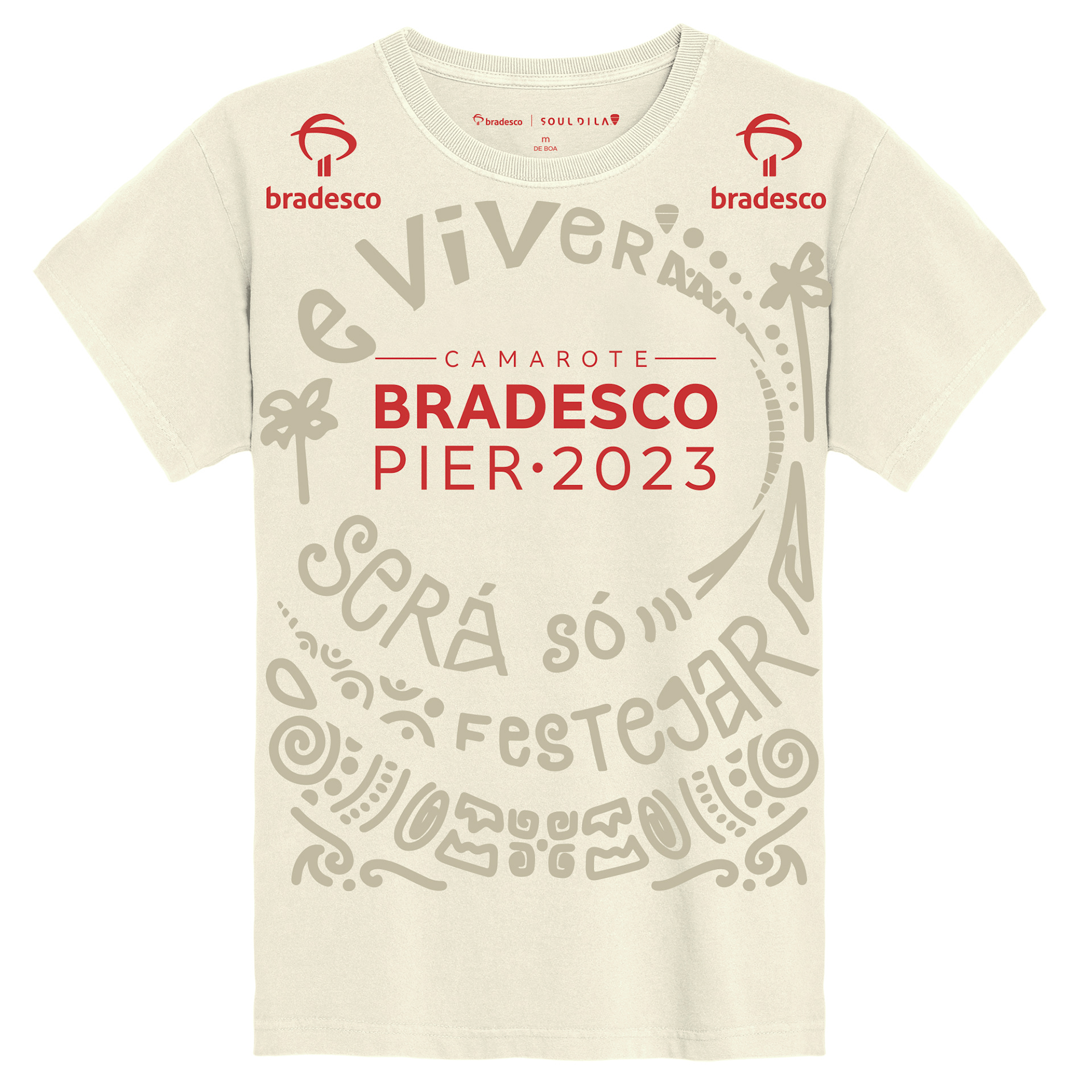 A ideia do Bradesco era criar algo especial que fosse memorável e não fosse apenas um abadá descartável como é normalmente o material desse tipo. Para isso, minha missão era criar estampas exclusivas para camisetas 100% algodão que traduzissem a festa e conversasse com a história do Bradesco nessa festa.
